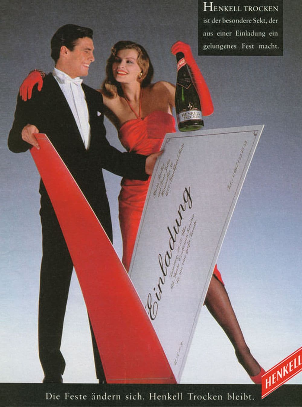 Das kräftige Rot und die ausdrucksstarke Farbigkeit der Anzeigen waren fast so wild wie die 80er. Der Zeitgeist war getroffen: Die Motive der „Roten Serie“ gewannen zahlreiche Kreativ-Auszeichnungen. Neuer Slogan: „Die Feste ändern sich. Henkell Trocken bleibt.“