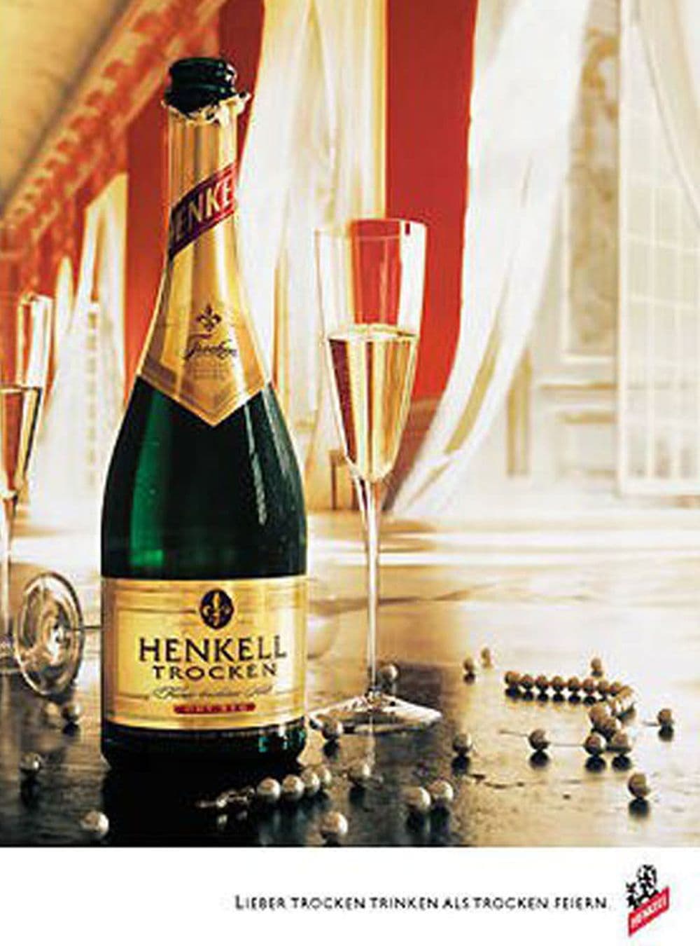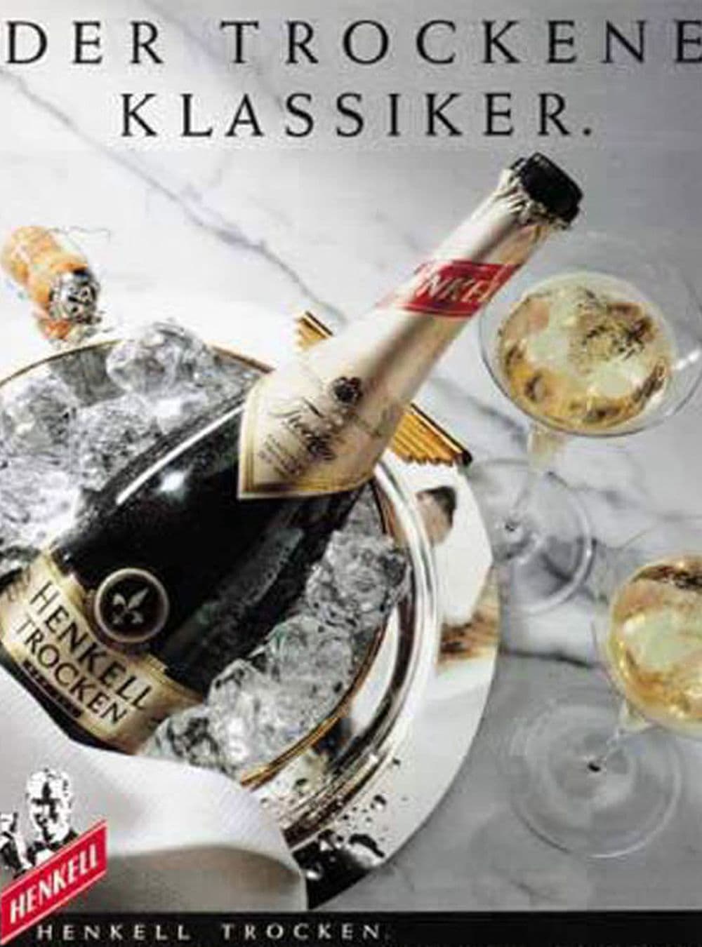 Noble Stillleben mit Henkell Trocken prägen Anfang bis Mitte der 90er Jahre die Anzeigenserien. Ein klares Bekenntnis zur Qualität. Zurück ist das Markenzeichen für Henkell Trocken: Der Schwarze Herr setzt als Kenner und Genießer mit klassischer Eleganz wieder einen deutlichen Akzent.