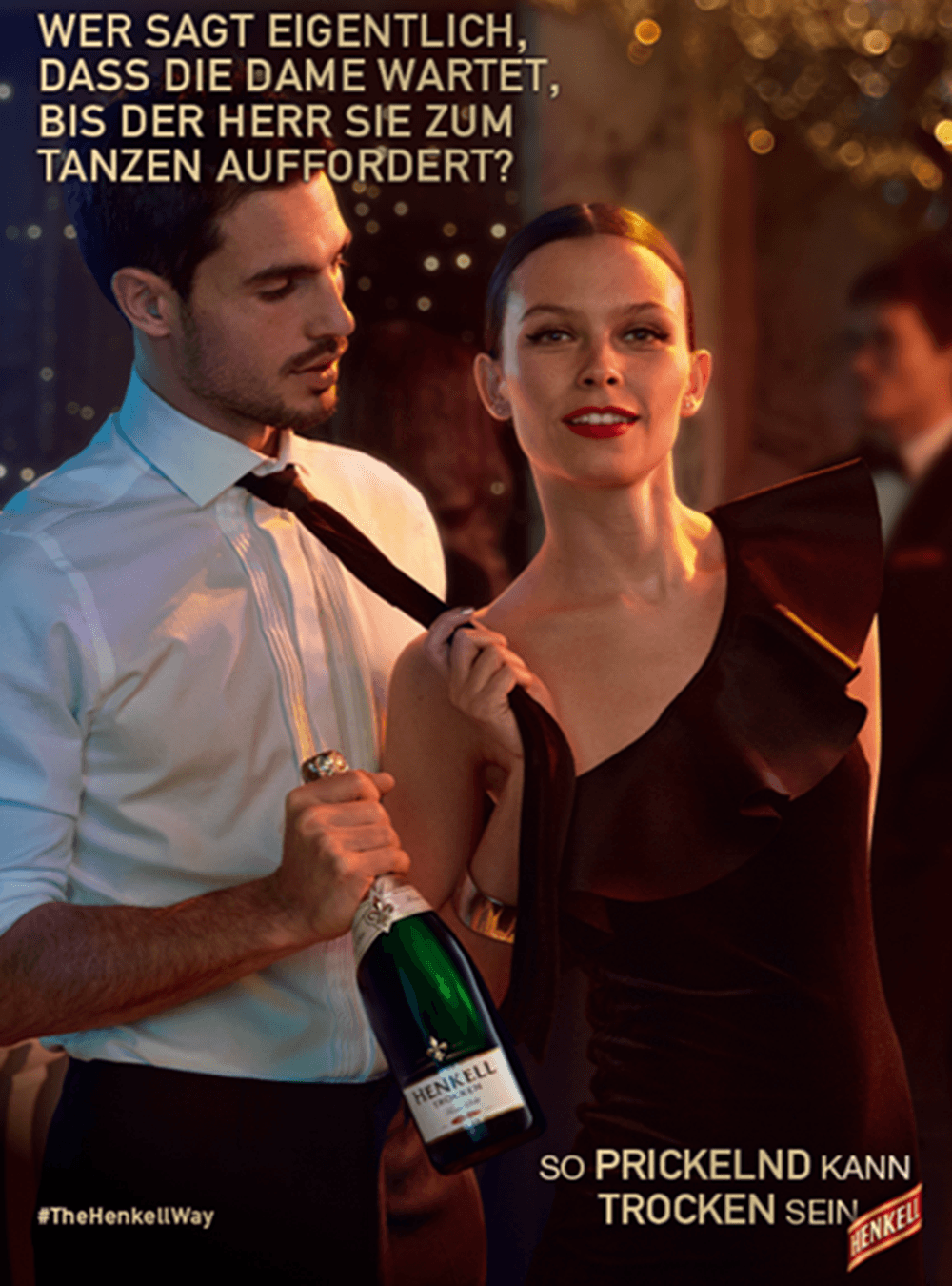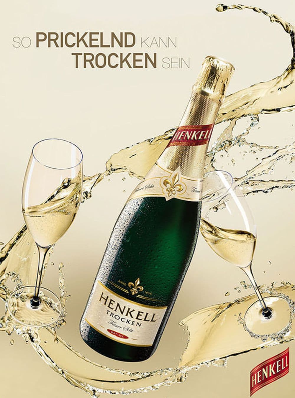 Dies zeigt sich auch im neuen Anzeigenmotiv: Das neue Henkell Design wird von dem schwungvollen Claim "SO PRICKELND KANN TROCKEN SEIN" begleitet und vermittelt temperamentvolle und prickelnde Lebensfreude.