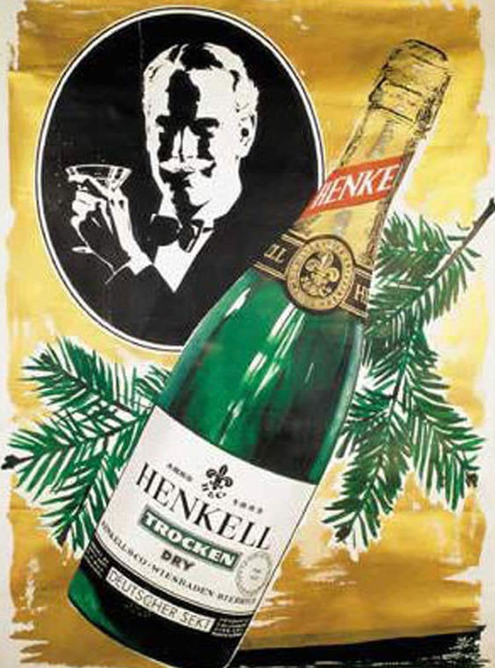 Mit diesem Weihnachtsmotiv und dem Schwarzen Herrn startete die Nachkriegswerbung für Henkell Trocken. Das Manko in dieser Zeit: Anfang der 50er Jahre wurde noch immer eine hohe Sektsteuer erhoben - der so genannte Kriegszuschlag, der den Sekt für viele zum Luxus machte.